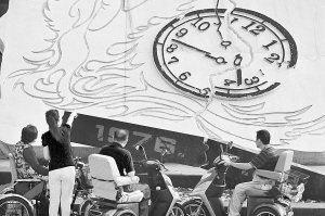 7月24日,10名生活在唐山市截瘫疗养院的地震伤员在医护人员和青年志愿者的全程陪同下,来到唐山地震遗址纪念公园,用敬献鲜花和默哀的方式表达对地震中罹难亲人的哀思。