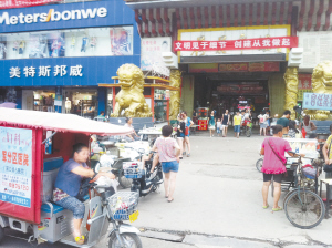 在南门,记者看到几位工人正在整修大门,门口的道路上摆着两个水果摊。两侧人行道上,商户出店经营,流动商贩占道经营、车辆乱停乱放等现象比比皆是。