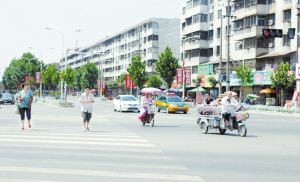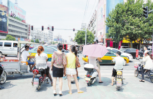 由于正值11时,通过该路口的行人非常多。虽然是一天当中最热的时候,但通过路口的行人和骑电动车的市民都在等绿灯(如图五)。绿灯亮时,“安全岛”上挤满的等待通过的行人一拥而过,场面颇为壮观。