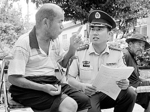 在“八一”建军节来临之际,为弘扬拥政爱民的优良传统,鹿邑县消防大队官兵带着大米、食用油等慰问品,深入到该县涡北镇敬老院看望慰问了那里的孤寡老人。图为消防队员为敬老院的老人讲解夏季防火知识。