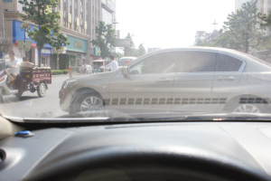 10时20分,记者驱车在七一路上自西向东行驶,快走到七一路与五一路交叉路口时,一辆咖啡色的本田轿车在路上调头(如图四)。这辆本田轿车自西向东行驶过程中,后面跟了两辆车。行驶过程中,本田轿车突然降低了行驶速度,也不打转向灯,司机向左后方看了一下,就一把拧过方向盘,压着双黄线强行掉头。跟在本田轿车后面的车赶紧刹车,要不是司机反应快,两辆车就“亲密接触”了。而且,由于这辆本田轿车强行调头,导致后面有五六辆车堵成一排。