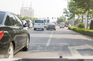 7月29日9时,记者在中州大道自南向北行驶,通过一处红绿灯时,一辆小轿车强行插队,把另一辆车挤到一边(如图二)。“这种行为很粗鲁,如果是新驾驶员遇到这种情况,很容易发生交通事故。”一执勤交警说。