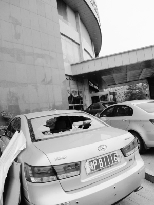 某停车场内,大风刮来的重物砸破一辆汽车的后车窗。晚报记者 朱海龙 摄