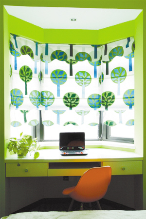 周边草绿色的墙面漆做基调,搭配色彩鲜艳明快、图案感很强的窗帘,在窗前小坐,如沐春风。简洁、单纯、明快的装饰自然环保又时尚,早起的阳光透过窗帘映进来,还以为正酣睡于青翠的草坪和茂密的枝叶下。