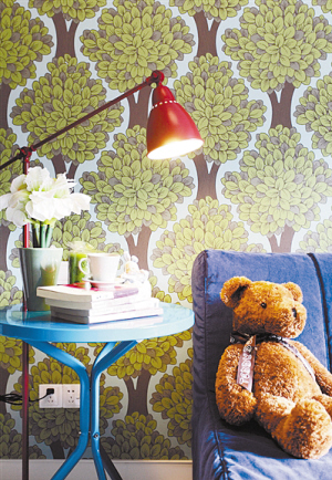 大面积的绿色小树图案壁纸,连续排列的图案和装饰味道,用时尚的方法将自然引进居室。壁纸中巧妙地运用各种层次的绿色调,使得树叶看起来栩栩如生,红色的台灯点亮了树林里的沉闷。