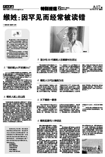 记者说明来意后,村支书缑贵山请来了村里的几位长者。缑保成是缑贵山的父亲,今年74岁,他爽朗地说:“我姓缑(gōu)不姓侯(hóu),我这个姓不仅少,就是看到这个字,能读对的也很少。早些年在外地的时候,我跟别人介绍自己时,总会先用笔写出我的姓,然后再告诉别人怎么读。如果只是写下来,别人不是读成‘候’就是念成‘维’,干脆我就先写下来再读给他们听,这样也算推广我的姓了。”