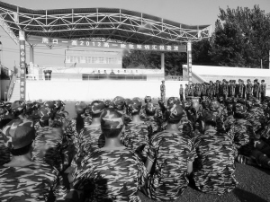 本报讯 清一色的迷彩服、迷彩帽,宽阔的运动场上是整齐的方阵(见下图)。昨日下午5时,周口一高举行高中新生军训汇报表演,该校1700多名高一新生参加检阅。“由于近日高温天气,我们学校根据实际情况,制订了一系列人性化举措,确保学生安全。如遇37℃以上天气,我们将暂停室外军训,安排丰富的室内活动,如国防教育、队列训练、安全教育、主题班会等。”副校长孙东来告诉记者。