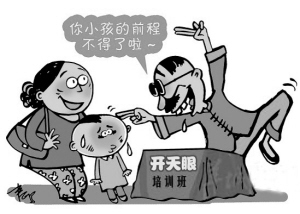为了不让孩子输在起跑线上,很多家长特别迷信一些所谓的培优班、特长班、兴趣班,巴不得把孩子培养成一个能歌善舞、能写会画、能说会道、能文能武的“全能天才”。一些培训机构正是利用了家长们这种心理,赚了个盆满钵满。看到有利可图,一些打着培训幌子的“骗钱班”也混进来了,“开天眼”培训班就是典型一例。正常人都知道,所谓“天眼”只是神话传说,通过培训能打开孩子的“天眼”根本就是无稽之谈。令人瞠目结舌的是,居然有家长相信这种不堪一拆的“天价”骗局!可见他们的盲目到了何种地步。