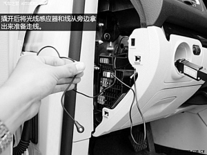 再将裸露在外的线缆全部用一字螺丝刀仔细地捅进中控台的缝隙中,然后把光线感应器黏贴在中控台的最前端,让其可以充分感应到外界的实际光量,以做出正确的判断。