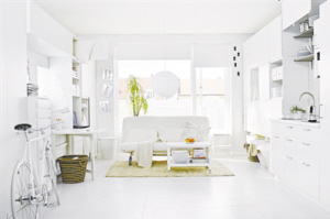 借鉴:白色调装饰搭配原木设计非常亲切和朴实,富有变化的木纹肌理打破了白色空间的单调感,深浅不同的灰度地毯也会给纯白居室增添舒适和温暖。