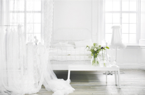 借鉴:轻柔的白色设计多运用纱幔和蕾丝,更能体现女人的温柔和轻巧,铁艺设计的选择既能体现纤巧之感,也可以同柔软的纱质形成对比。木色的地板、绿植和素色花朵,令安静的空间有了生机。