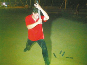 经过简单热身后,表演开始。一整套精彩的地趟腿、兵器、地趟拳之后,周俊已是大汗淋漓。此时天色已黑,周围消夏的市民闻讯也纷纷赶了过来,迅速围成了一堵人墙。记者掂了掂长30厘米、厚约4毫米的沉甸甸的钢板,不禁暗暗担心。
