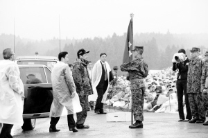 图为日本防卫大臣小野寺五典(左三)进入演习现场。新华社记者 刘天 摄