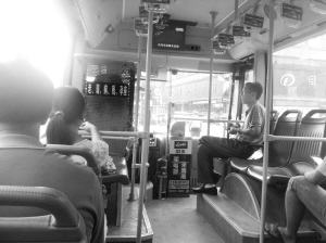 8月26日下午,记者在东新区坐上16路公交车。上车后,记者看到车上的老幼病残专座旁设置了醒目的提示语(图三),车内张贴了行车路线图、禁止抽烟标识及公交车监督举报电话。每当乘客上下车,车上广播均提示“请将座位让给更需要的人”“请不要在车内抽烟、乱扔杂物”。对此,乘客表现得非常配合,一路上,不断有人向老人和抱小孩的乘客让座。公交车上的卫生保持得也不错,记者没看到有人乱扔杂物。