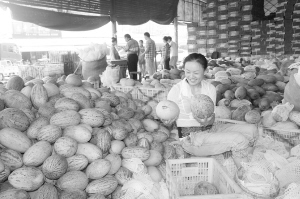 在水果批发市场一处哈密瓜批发点(如图),100多吨哈密瓜辗转几千里刚刚卸车,就遭到来自我市各地的水果销售商疯狂抢购。哈密瓜经销商张女士告诉记者,立秋以来,西瓜、甜瓜陆续退市,此时成熟的新疆哈密瓜正好填补了水果销售空档,而且价格不高,批发价每公斤3元左右。为了保证货源,张女士和几个亲戚在本地负责批发销售,她的丈夫则长驻新疆负责订货、装车,生意最好时3天就能卖一车(每车60吨),中秋节期间他们能收入七八万元。