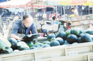 图一:昨日11时许,中州大道上,一位瓜农在卖瓜间隙坐在瓜车上,入迷地看着杂志。