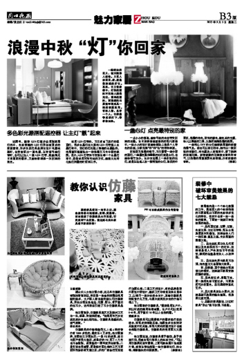 徐立君还说,仿藤家具便于搬动,易于清洁打扫,很适合现代都市人的生活方式,“可以用仿藤屏风做背景墙,上面可挂些照片做成照片墙,或者在旁边搭配一些仿藤落地灯、烛台等,增添整体的休闲氛围。”(郝婧羽)
