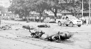 事故发生在桂林市灵川县八里街学校大门附近,事故现场已被警方拉起警戒线防止市民靠近。警车、消防车进驻现场。现场一片狼藉,一具疑似爆炸中遇难者遗体横在现场,多辆摩托车、电动车翻倒在路面上。附近部分商铺玻璃被震碎,一些停在附近路边的汽车玻璃也被震坏。