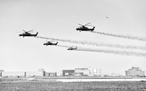 9月5日至9月8日,第二届天津国际直升机博览会举行。陆航“风雷”直升机飞行表演队驾驶国产武直-10、武直-9直升机进行组建以来的首次飞行表演。不同于珠海航展上的简单飞行展示,此次长达25分钟的飞行表演中,武直-10大“秀”飞行绝技,16个单机、双机和多机动作令人叹为观止。新华社记者 杨光 摄