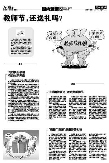 江苏省东台中学的孙老师认为,教师节给老师送礼,应该注重精神层面。“收到孩子们自己制作的礼物,虽然礼轻但情意重,是很大的安慰。指望学生家长送礼改善生活的老师,毕竟是极少数。”