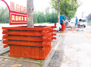 昨天上午,东新区周口大道和庆丰路交叉口西北角处,几名工人正在给十几棵行道树安装栅栏。据了解,这些栅栏是落户东新区的“昌建地产”自己掏钱请人为其展示中心门前的行道树安装的。