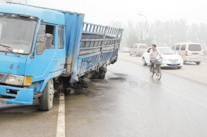 昨日6时50分许,记者接到线索赶到现场,只见大桥上一辆货车停在路边(如图),现场地面上有很多油,货车油箱有燃烧痕迹。货车传动轴断裂,后轮车桥严重变形,一旁则有许多事故后轿车的遗留物。