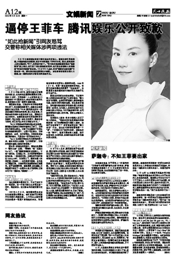 14日下午4点多,腾讯娱乐终于做出回应,通过微博公开致歉,称对王菲回京新闻采访过程中发生的“截停并过度拍摄行为”和审稿不严对王菲本人和其他受此事件影响的人受到的伤害表示诚挚的歉意。