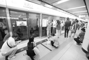 图为乘客在北京地铁四号线宣武门站等候。