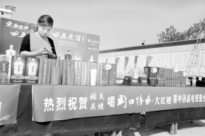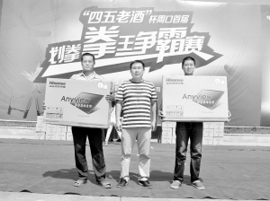 由河南四五酒业在时隔20年之后重新推出的周口特曲(大红袍)上市后,深受市民的好评。为扩大市场占有率,他们推出“喝大红袍,中液晶电视”活动。图为9月14日,两位消费者在市区五一广场喜领中奖电视机。(记者 付永奇)