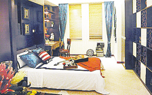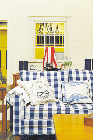 | 宝蓝色的窗帘和抱枕,加上黑白格子的柜子,整个空间点缀大红大紫的布艺,色彩多而不乱。白色床品上随意摊开的红毯,鲜明的美国标志抱枕,仿佛是回到十八、十九世纪的西部牛仔时期。