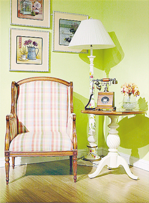 | 红、黄、绿等原色搭配的单人布艺沙发,布满了小花的精美落地灯,配上黄绿色的墙面,给人温暖的触感。