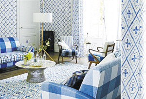 | 菱形格子少了方格的中规中矩,但却依然保留着格子的清新味道,再配合着撞色的蓝色座椅和沙发,石头的茶几和玻璃的摆件,如同夏末秋初的一款凉风,吹入房间。