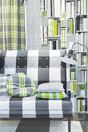 | 黑白格子沙发添加了时尚感。绿色格纹点缀在窗帘、书架和抱枕上,增加了清新宁静的感觉。
