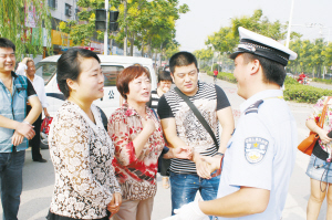 昨日9时许,在工农路与黄河路交叉路口,被救孩子祥祥的家人特意来感谢他们的恩人。祥祥的姥姥离老远就看见了交警王双喜,祥祥的姥姥和妈妈立刻跑过去握住王双喜的手说:“找你两天了,我们总算找到你了,你是我们的恩人,谢谢你救了俺孩子。”