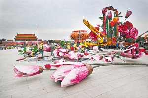 9月20日,北京,天安门广场国庆花坛正在搭建中。据了解,2013年北京确定了国庆花坛“规模适度、厉行节约、服务大众、贴近生活”的花卉布置原则,天安门广场国庆花坛布置将整体“瘦身”,天安门广场东西侧路以及天安门两翼地区将不再进行容器花卉布置。政府机关门区原则上不摆放大型花坛,朴素过节,减少行政支出。李学仕 摄