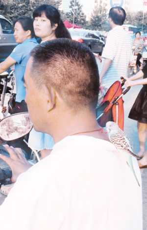 9月21日,在周口市区五一路与七一路交叉口附近,一只彩色鹦鹉自由自在地站在主人肩上,陪着主人逛街。市民看后无不啧啧称奇。据鹦鹉的主人说,他饲养这只鹦鹉1年多了,买来不久就训练它站在自己肩上一同外出逛街。现在,即使他穿梭在人群里,鹦鹉仍镇定自若。晚报记者 徐松/摄