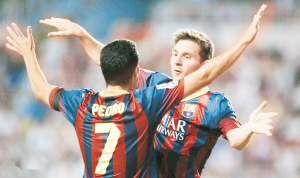 本报综合消息 北京时间9月22日,2013/14赛季西班牙足球甲级联赛第5轮一场焦点战在特雷萨·里维罗球场展开争夺,巴塞罗那客场4∶0大胜巴列卡诺,佩德罗上演帽子戏法,梅西和内马尔均贡献助攻,法布雷加斯传射锦上添花。巴尔德斯还扑出一次点球。巴萨全胜继续领跑。