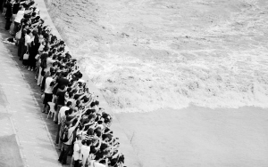 9月22日,游客在浙江海宁盐官观潮公园观看钱塘江“一线潮”。