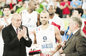 当地时间9月22日,法国队球员帕克(中)获得MVP(最有价值球员)奖杯。