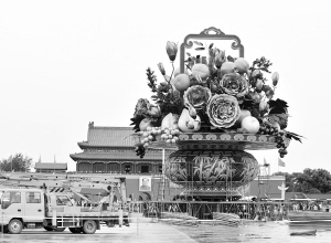 北京天安门广场“祝福祖国”花坛的主景“花果篮”于9月23日凌晨完成主体结构安装。“花果篮”以清代画家丁亮光的作品为灵感来源,结合传统水墨画手法,绘制的竹林代表“祝”,篮盘外侧雕刻的蝠纹代表“福”,篮内采用传统中式插花造型,使用了牡丹、玉兰、松枝、竹子四个品种的大型仿真植物,摆出石榴、苹果、蟠桃、葡萄等水果造型,篮中花团锦簇,硕果累累,表达了富贵吉祥,平安幸福等良好寓意,突出体现了中华文化的深厚底蕴。 新华社记者 李文 摄