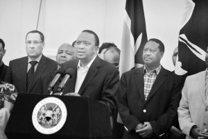 当地时间9月22日,肯尼亚总统乌胡鲁·肯雅塔(中)与反对党就首都内罗毕袭击事件等问题召开联合新闻发布会。
