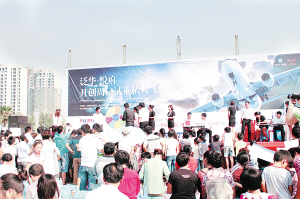 当天上午8点,周口南区市政广场已是人头攒动,人们或开车、或步行、或打的,陆陆续续从四面八方赶来,他们中有年轻人,也有鹤发童颜的老翁;有单独来的、有全家出动的,也有结伴而行的。大家或围着飞机指指点点,或挤在舞台前等待观看演出。9点不到,广场上已聚集了2000余人。一位从农村赶来的老大爷告诉记者:“我长这么大,也没有这么近距离看过飞机,今天终于圆了这个梦想了。”从市区赶来的王先生说:“中秋佳节,带着小孩看看直升飞机,也算是一次科普教育吧。”9点18分,“月圆、情圆、梦圆——泛华·悦府首届私人直升飞机展”活动正式开幕。首先是激情四溢的水鼓舞表演。在水花四溢的舞台上,火辣的美丽少女舞动其曼妙的身姿,敲打出迷人的旋律,让台下的观众如痴如醉。接着是众人期盼的幸运大转盘、抓钱币等感恩回馈活动。泛华新城为这次活动特地准备了雨伞、豪华月饼、现金抵扣券等价值数万元的活动礼品,观众只要参与,就有礼品赠送。当天参与者既有天真无邪的小萝莉、萌男孩,也有慈祥可敬的七旬老人。伴随着观众的阵阵欢呼声和尖叫声,大奖一个接一个地出现,许多人拿奖品手都拿累了。不过,让大家大跌眼镜的是,很多大奖往往被可爱的小孩子们拿走了,这让许多参与者感慨不已,可又感觉合情合理。