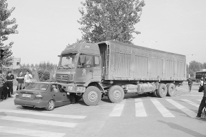 9月26日15时许,一辆车牌号为豫PE7562的红色东风悦达起亚小轿车行驶至东新区文昌大道与政通路交叉口时,车辆左转弯想直接进入文昌大道边道,结果与一辆车牌号为豫PC2266的大货车迎面相撞,小轿车前半身钻入货车底部,险被压扁。所幸事故仅造成1人轻伤。晚报记者 徐松 摄
