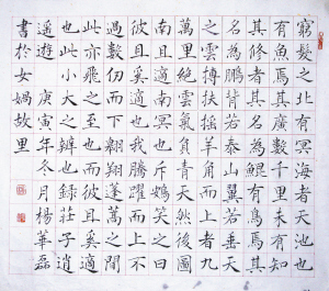 其书法作品取法晋唐,结体严谨整饬,风格清雅隽秀。师从刘登龙先生,钟情小楷书法,于《宣誓表》、《黄庭经》、《灵飞经》等用力尤勤,大字取法唐楷、《阴符经》等。作品多次刊发于《书法导报》等专业刊物。