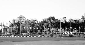■ 文莱首都斯里巴加湾市街道两边悬挂着东盟及对话伙伴国的旗帜