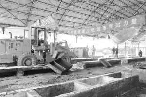 本报讯 10月10日15时许,周口市区八一大道农贸市场内,一台大型机械加足马力将市场遮阳棚下的水产区、生鲜区柜台一一拆除(如图),这标志着该农贸市场搬迁工作接近尾声,拆迁工作正式启动。