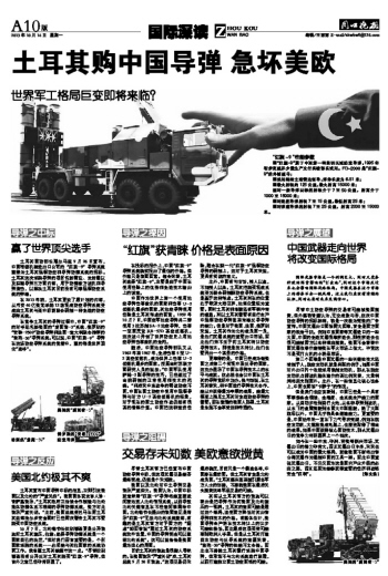目前土耳其的表态是很耐人寻味的。在美国表示“严重关切”后,土耳其总统9月30日表态,“这项交易仍未最后确定,目前只是一个候选名单,中国排在最前面。但土耳其首先是北约成员国。”土耳其媒体甚至援引匿名军方人士的话称,不排除美国在最后关头搅黄这单军品交易的可能。