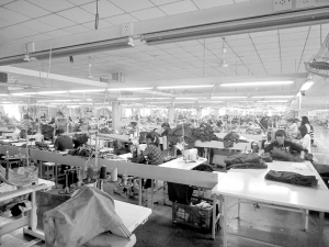进入鼎祥制衣,映入记者眼帘的是10个标准化生产车间。车间里,800多名工人紧张有序地加工出服装的各个部件后,通过流水线作业制出一件件服装(如图)。公司相关负责人介绍,该公司目前有40条现代化生产线,3600名员工年产服装1000多万件。2010年8月投产后,经过两年多的运营,2012年年产值达到6.5亿元,年创利税2600万元。