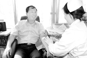 10月11日上午,市直医疗卫生单位“无偿献血周”活动启动,仪式上副市长张广东登上采血车献血。工作人员介绍,身为副市长的张广东已经连续献血15年了。张广东说:“身为副市长和一名医生,我用自己的行动告诉大家,献血无害健康,献血帮助他人快乐自己。”