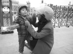 前天,我市最高气温超过30℃,不少市民外出时还穿着短袖。昨天,受强对流天气影响,我市大幅降温,不少市民换上了厚外套。图为昨天傍晚,在周口市区一家幼儿园门前,家长为孩子穿上薄棉袄。